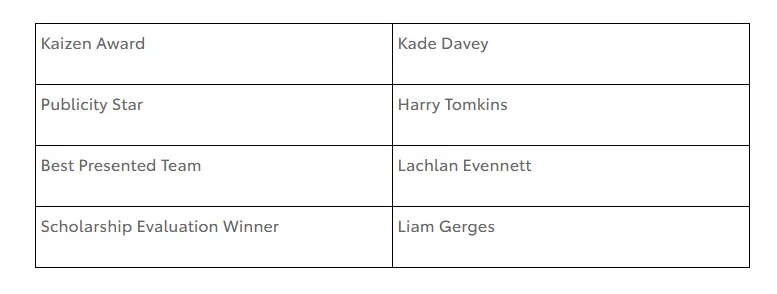 The Kaizen Award, presented to the driver who showed continuous improvement over the course of the year, was awarded to Kade Davey, who was also commended for his eagerness to learn, support for his teammates and the respect with which he treated everyone.