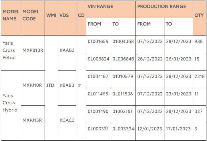 A1. There are approximately 3,512 Toyota Yaris Cross vehicles involved in the Australian market within the following VIN range.