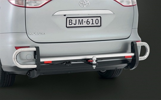 The Toyota Genuine Tow bar with Rear Step and Side Protector allows you to tow with confidence. Providing rear corner protection and an anti-slip extruded aluminium platform, it blends stylishly with the Tarago's rear whilst delivering maximum towing capacities of 1,600kg (braked) and 600kg (unbraked) with a 160kg maximum ball down load. GLX and Ultima models require factory fitted parking sensors to be deactivated. Tow Bar with Rear Step and Side Protector, Tow Ball, Trailer Wiring Harness sold separately.